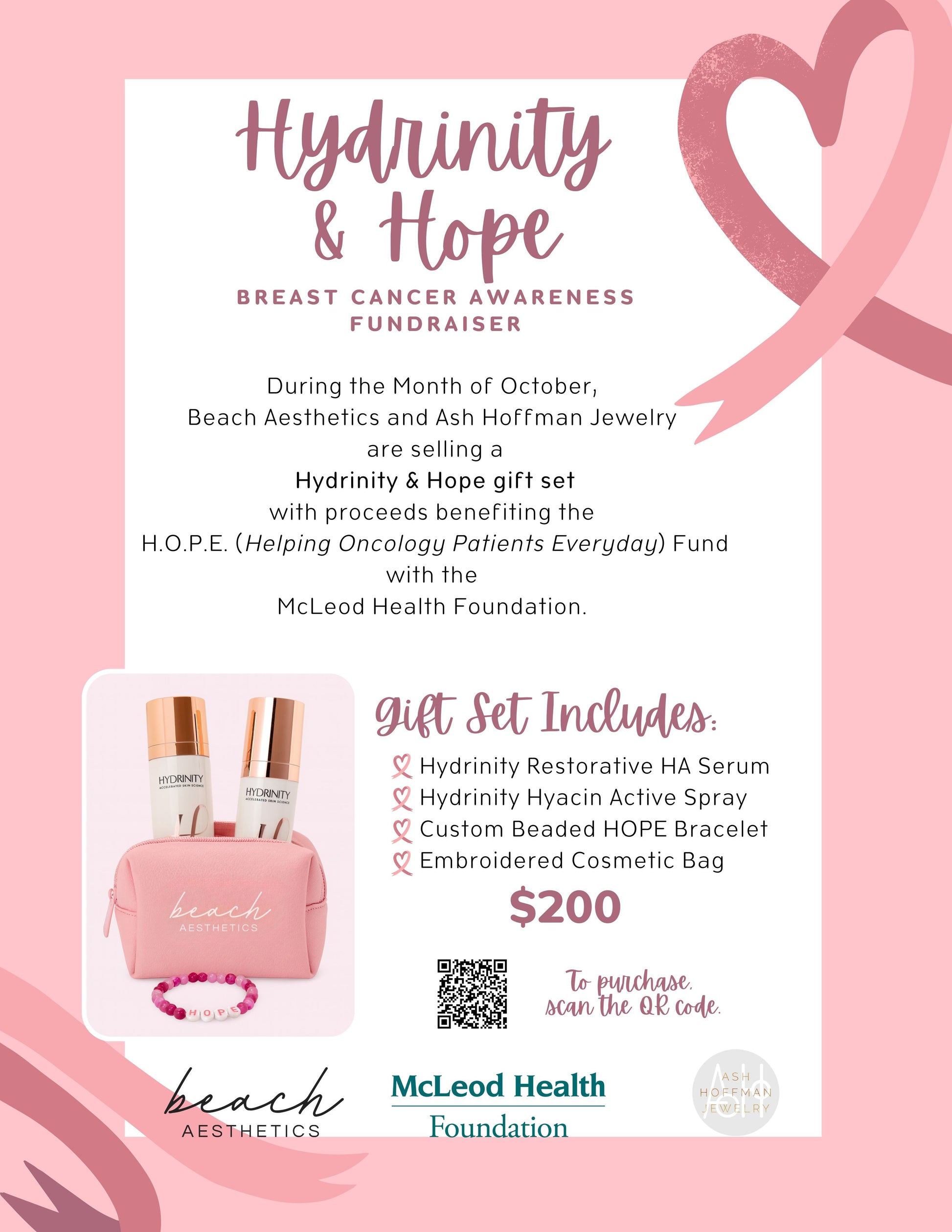 During the Month of October, Beach Aesthetics and Ash Hoffman Jewelry are selling a Hydrinity & Hope gift set with proceeds benefiting the H.O.P.E. (Helping Oncology Patients Everyday) Fund with the McLeod Health Foundation.